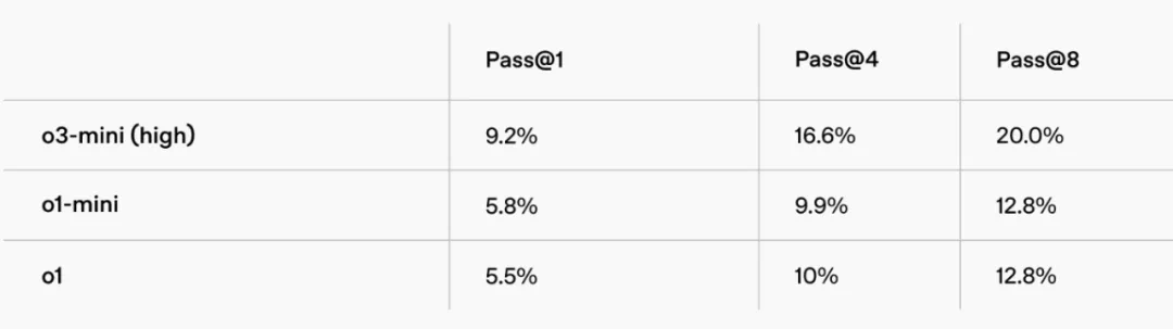 软件工程:o3-mini 是 OpenAI 发布的在 SWEbench-verified 上表现最好的模型。o3-mini-high 使用开源 Agentless 框架可达到 39% 的准确率,使用内部工具可达到 61% 的准确率。