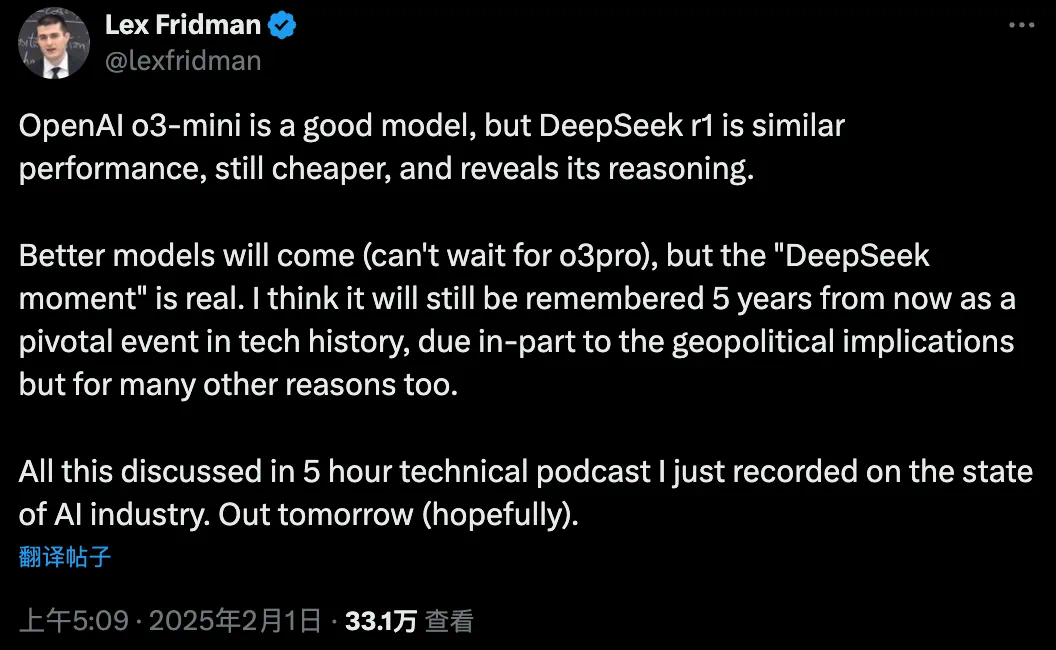 知名播客主理人 Lex Fridman 表示,OpenAI o3-mini 虽然是一个很好的模型,但 DeepSeek r1 的性能相似,而且更便宜,并揭示推理过程。
