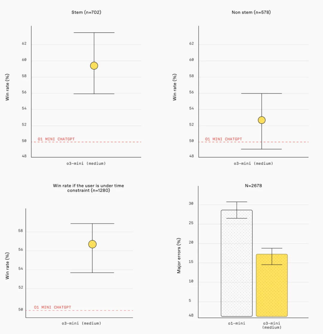 人类偏好评估:外部专家测试人员的评估显示, o3-mini 产生的答案比 o1-mini 更准确、更清晰,推理能力更强,特别是在 STEM 领域。测试人员在 56% 的情况下更偏好 o3-mini 的响应,并观察到 o3-mini 在困难的现实问题上重大错误减少了 39%。