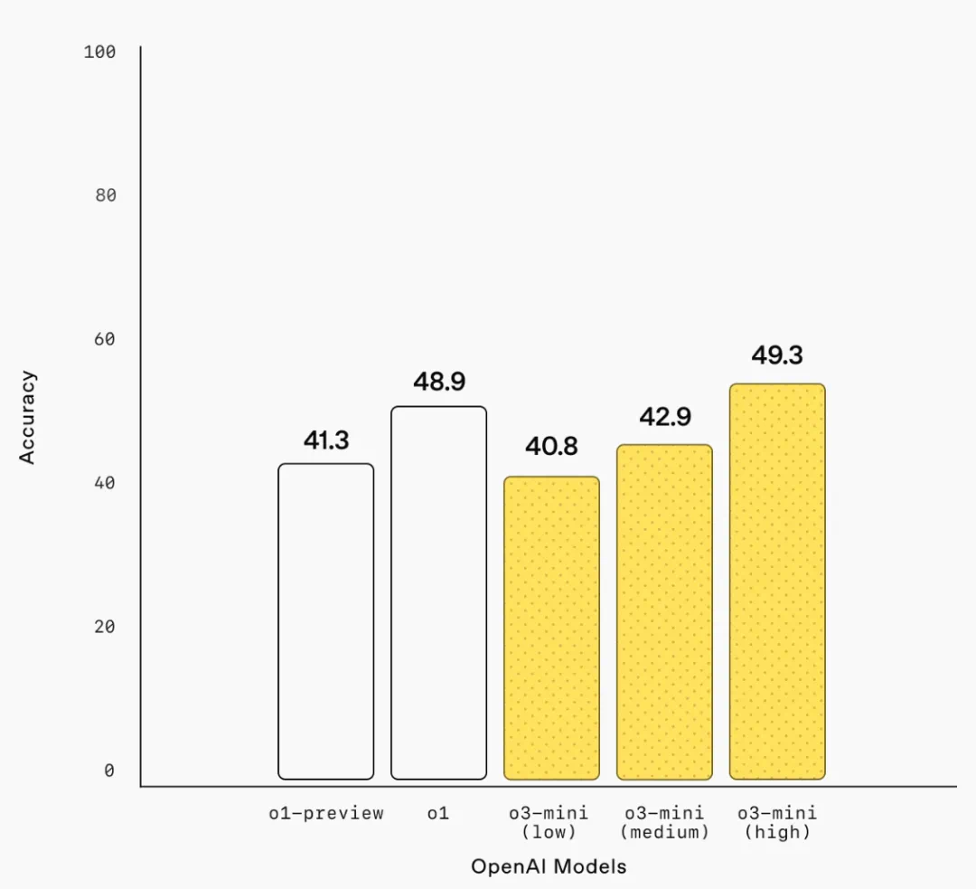 博士极科学问题:o3-mini-low 的表现优于 o1-mini。o3-mini-high 的表现与 o1 相当,在博士级生物学、化学和物理问题上都显示出显著进步。