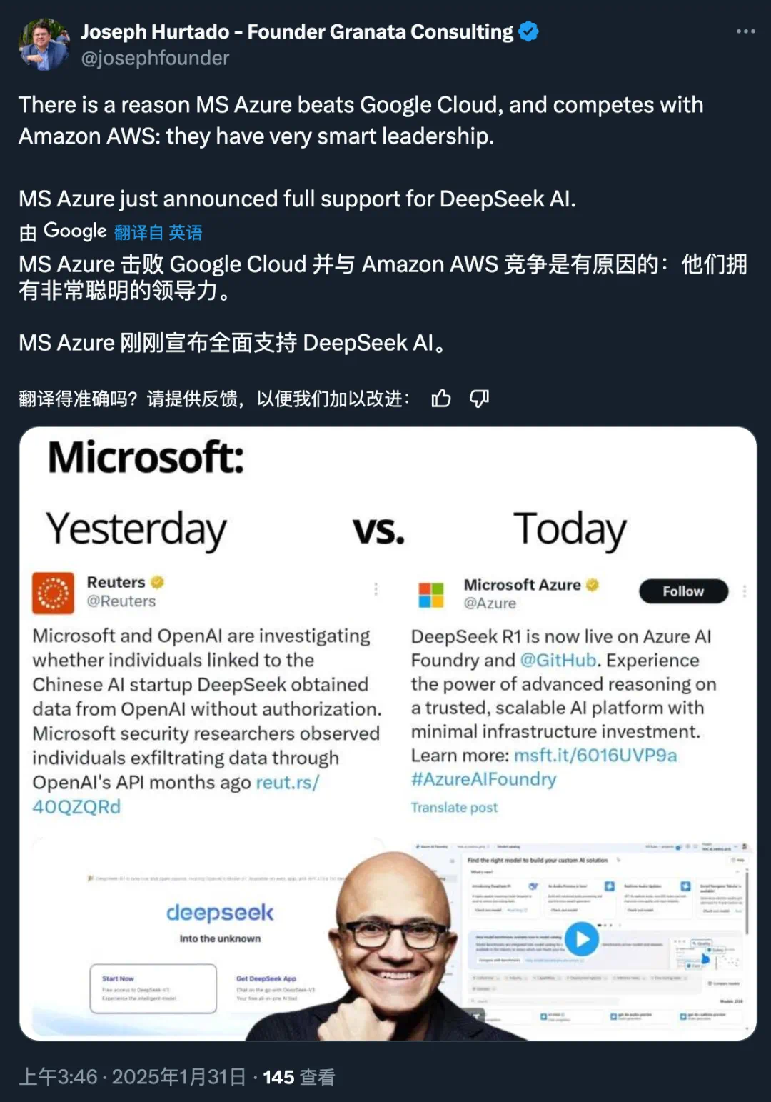 毕竟昨天的微软还在说:DeepSeek 非法窃取了 OpenAI 的知识产权。而今天的微软:DeepSeek 现已在我们的 AI 平台上推出,欢迎大家尝试。