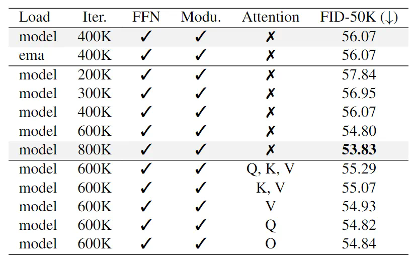 DiT 的预训练权重,即使只训练了 200K 步,也起着重要作用,将 FID 从 63.24 提高到 57.84。 -