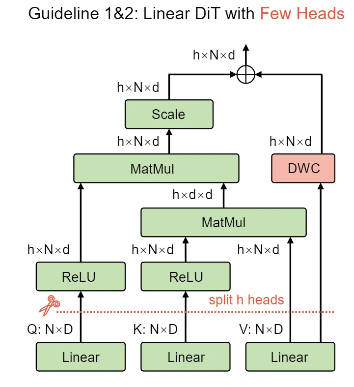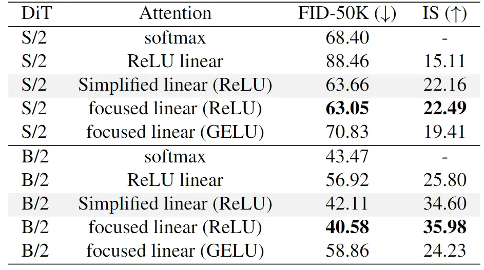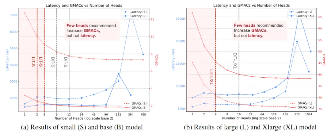 使用极简线性注意力机制足够扩散模型完成图像生成。除此之外,线性注意力还有一个「免费午餐」,即:使用更少的头(head),可以在增加理论 GMACs 的同时 (给模型更多计算),不增加实际的 GPU 延迟。 -