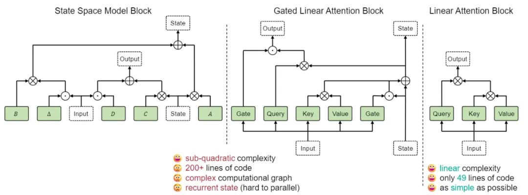 其二,SSM 和 GLA 模块的计算图相对于 线性注意力 而言更加复杂,而且会引入一些算数强度 (arithmetic-intensity) 比较低的操作,比如逐元素乘法。
