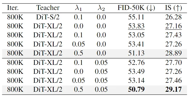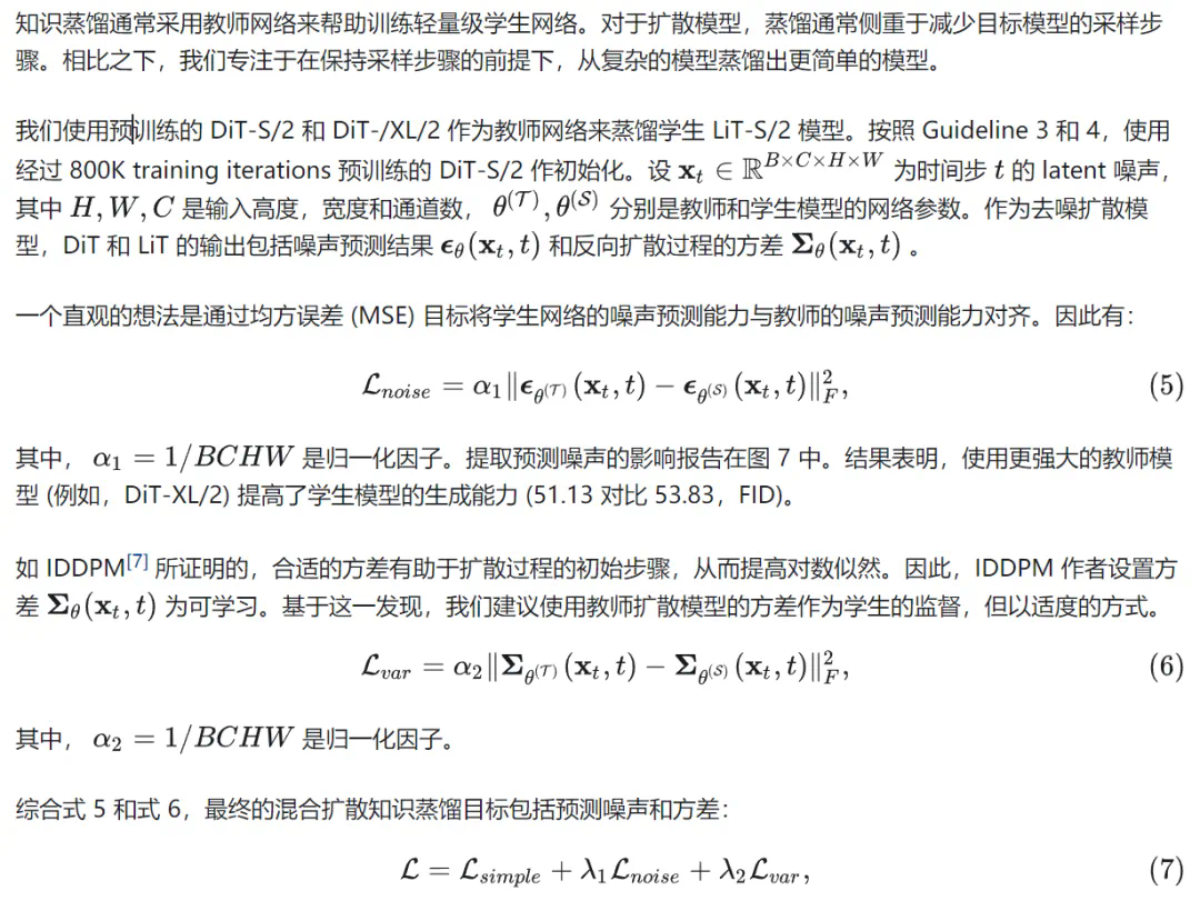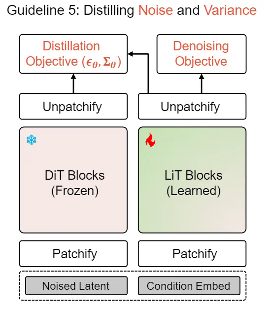 可以使用知识蒸馏(Knowledge Distillation)加速训练。但是,在设计 KD 策略时,我们强烈建议不但蒸馏噪声预测结果,同样也蒸馏方差预测结果 (这一项权重更小)。