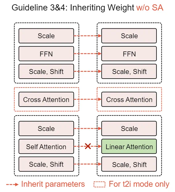 线性扩散 Transformer 强烈建议从一个预训练好的 Diffusion Transformer 里做权重继承。但是,继承权重的时候,不要继承自注意力中的任何权重 (Query, Key, Value, Output 的投影权重)。 -