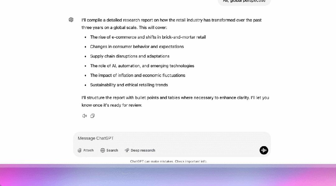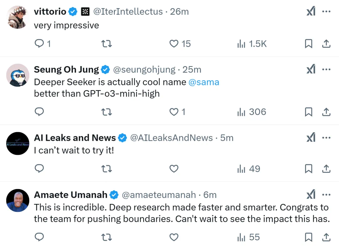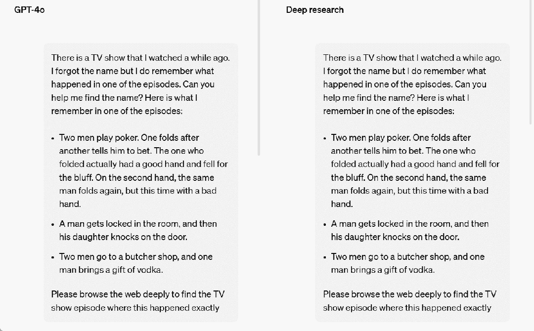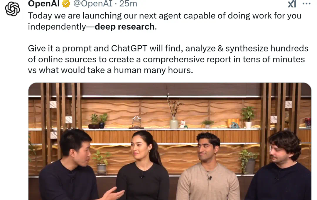 一觉醒来,OpenAI 又发新产品了,这次是面向深度研究领域的智能体产品 ——「Deep Research」。具体来讲,这是一个使用推理来综合大量在线信息并为用户完成多步骤研究任务的智能体,旨在帮助用户进行深入、复杂的信息查询与分析。目前,Pro 用户现已可用,接下来还将开放给 Plus 和 Team 用户使用。有了这个新的智能体,用户将可以在 ChatGPT 中开启深度研究,在几十分钟内完成人类需要数小时才能完成的工作。作为 OpenAI 的下一代智能体,Deep Research 可以独立为用户工作。用户给它一个提示,ChatGPT 将查找、分析和综合数百个在线资源,以研究分析师的水平创建一份综合报告。Deep Research 由即将推出的 o3 模型的一个版本提供支持,该模型针对网页浏览和数据分析进行了优化,它利用推理来搜索、解释和分析互联网上的大量文本、图像和 PDF,并根据需要根据遇到的信息做出调整。OpenAI 表示,综合知识的能力是创造新知识的先决条件。因此,Deep Research 标志着 OpenAI 朝着开发 AGI 的更广泛目标迈出了重要一步。OpenAI 长期以来一直设想 AGI 能够产生新颖的科学研究。从大家的反应来看,OpenAI 这次的智能体产品切中了用户的需求,甚至有人认为这是迈向智能体 AI 的重要里程碑。OpenAI 的 Deep Research 通过搜索网络并将知识综合成研究论文,这种自主研究标志着 AI 进入到了自我发现新知识的下一步。 图源:X@tsarnick构建 Deep Research 的目的Deep Research 是为那些在金融、科学、政策和工程等领域从事密集知识工作并需要彻底、精确和可靠研究的用户而量身打造的。同时,Deep Research 对于寻找超个性化推荐的挑剔购物者同样有用,这些推荐通常需要仔细研究才能购买如汽车、家电和家具。每个输出都经过完整记录,并附有清晰的引文和思路摘要,以便于引用和验证信息。同样地,Deep Research 在查找需要浏览大量网站的小众、非直观信息方面也特别有效。总之,Deep Research 让用户只需一个查询即可加快复杂、耗时的网络研究,从而释放宝贵的时间。此外,Deep Research 能够独立发现、推理和整合来自网络的见解。为了实现这一点,它接受了需要使用浏览器和 Python 工具的现实任务的训练,使用了 OpenAI 第一个推理模型 o1 背后的相同强化学习方法。虽然 o1 在编码、数学和其他技术领域表现出令人印象深刻的能力,但许多现实世界的挑战需要从各种在线来源收集广泛的背景和信息。Deep Research 利用这些推理能力来弥补这一差距,使其能够解决人们在工作和日常生活中面临的各类问题。如何使用 Deep research在 ChatGPT 中,选择「message composer」中的 deep research 并输入查询。告诉 ChatGPT 你需要什么 —— 无论是关于流媒体平台的竞争分析,还是关于最佳通勤的个性化报告都可以。甚至你也可以附加文件或电子表格,为问题添加上下文。一旦开始运行,侧边栏将显示所采取的步骤和使用的来源摘要。Deep research 可能需要 5 到 30 分钟的时间来完成其工作,因为它需要深入挖掘网络信息。在此期间,用户可以离开或处理其他任务 —— 任务完成后你会收到通知。最终结果将以报告的形式出现在聊天中 —— 在接下来的几周内,OpenAI 还将为这些报告添加嵌入的图像、数据可视化和其他分析输出,以提供更清晰的说明和上下文。与 deep research 相比,GPT-4o 更适合实时的多模态对话。对于需要深度和细节的各个方面、特定领域的查询,deep research 能够进行广泛的探索并引用每个声明。下面是一些 GPT-4o 与 deep research 对比。大海捞针。询问 GPT-4o:「前段时间我看过一部电视剧。我忘了名字,但我记得其中一集发生了什么。你能帮我找到名字吗?以下是我记得的一集内容:两个男人玩扑克。一个弃牌,另一个让他下注。弃牌的人实际上手牌很好,但被骗了。第二手牌,同一个人再次弃牌,但这次手牌很糟糕请深入浏览网页,找到发生此事的电视剧集。」GPT-4o 回答:「根据您提供的详细信息,您似乎指的是电视剧《仆人》中的一集。这部剧由 Tony Basgallop 创作,M. Night Shyamalan 担任执行制片人,于 2019 年在 Apple TV+ 上首播。故事围绕一对费城夫妇展开,他们在经历了巨大的损失后,雇佣了一名年轻保姆,导致他们家中发生了一系列令人不安的事件……」询问 deep research 同样的问题,其给出的答案:「您所描述的三个事件都发生在 Starz 系列剧《Counterpart》第一季第四集,标题为 Both Sides Now。在这一集中……」以下是完整过程:在上述例子中,deep research 被赋予了一个模糊的查询,即使对人类来说也很难找到答案,因为没有关键词能够轻易揭示查询的答案。deep research 能够以创造性和持久性的方式进行搜索,直到找到一个完全符合条件的结果。类似的对比还有通用知识(general knowledge)的查询:「NFL 球员的平均退休年龄是多少?」在这个例子中,deep research 提供了需要考虑的组成部分和因素,而不仅仅是一个数字。它更加全面,提供了清晰的统计背景,使用了支持性的例子,并直接解释了射门员相对于其他位置球员职业生涯较长的原因。这种细节和清晰度使得 deep research 更具信息量,并更直接地回应了那些希望了解 NFL 退休年龄趋势的人的需求。如何工作Deep Research 通过端到端的强化学习在多个领域的复杂浏览和推理任务上进行了训练。通过这种训练,它学会了规划和执行多步骤的轨迹,以找到所需的数据,并在必要时回溯和实时响应信息。Deep Re
