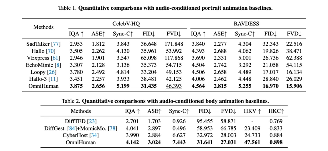 从项目主页上可以看到 OmniHuman 对肖像、半身以及全身这些不同人物占比、不同图片尺寸的输入都可以通过单个模型进行支持,人物可以在视频中生成和音频匹配的动作,包括演讲、唱歌、乐器演奏以及移动。对于人物视频生成中常见的手势崩坏,也相比现有的方法有显著的改善。