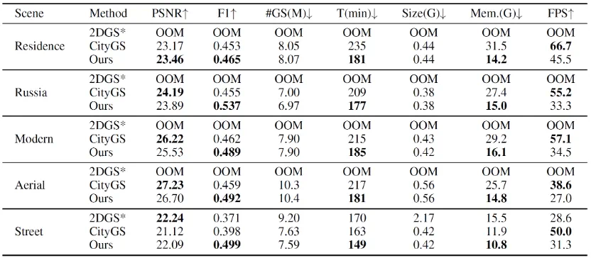 本工作致力于大规模复杂场景的高效精准重建,并建立了大规模场景下的几何精度评估基准。所提出的 CityGaussianV2 以 2DGS 为基元,消除了其收敛速度和扩展能力方面的问题,并实现了高效的并行训练和压缩,从而大大降低了模型的训练成本。在多个具有挑战性的数据集上的实验结果证明了所提出方法的效率、有效性和鲁棒性。