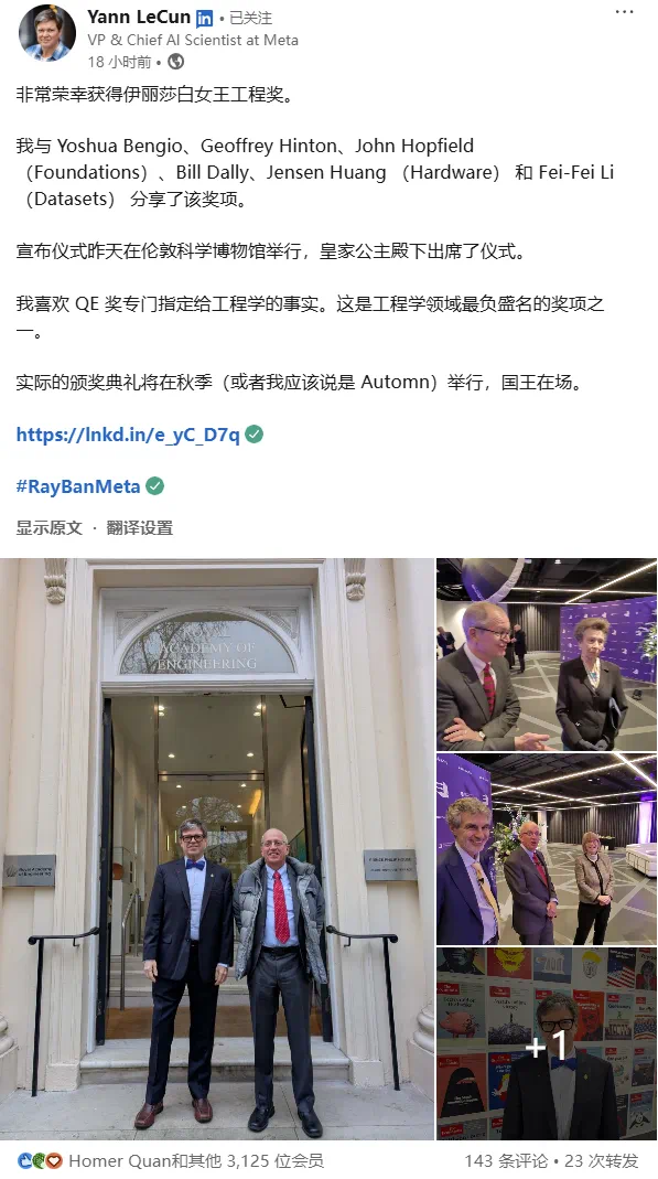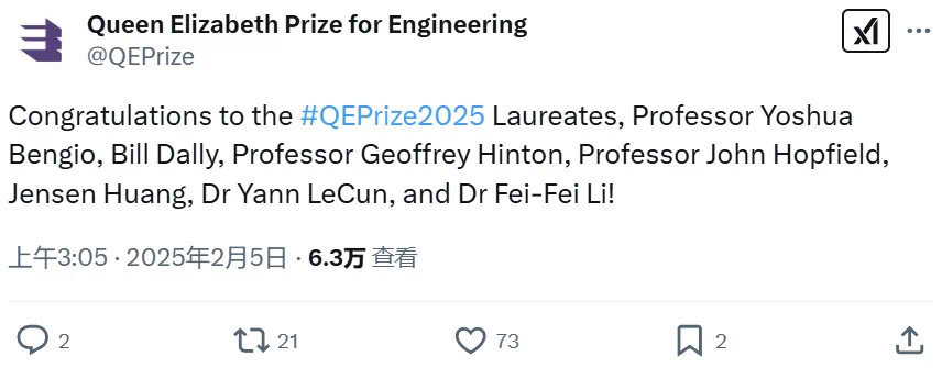 文章来源于互联网:每人50万英镑,Hinton、Bengio、黄仁勋和李飞飞等获得伊丽莎白女王工程奖