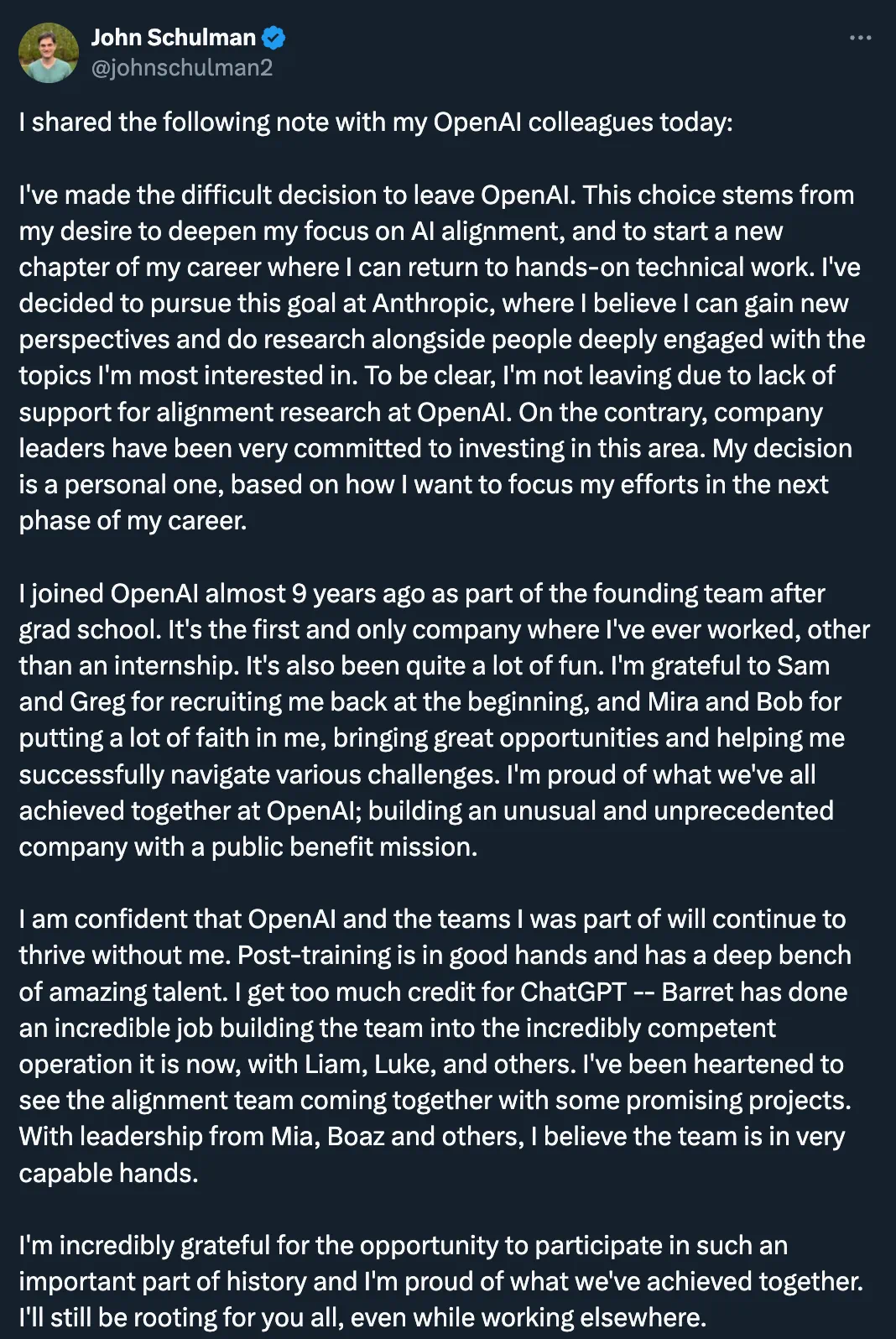 在去年 8 月的公开信中,Schulman 曾表示离开 OpenAI 是一个艰难决定。这一选择源于他希望进一步关注人工智能领域,并开启职业生涯的新篇章,重返实际技术工作。