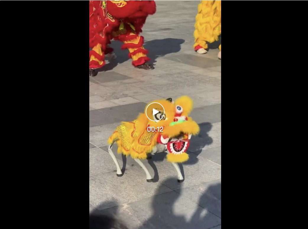 除了赛博放烟花,机器狗还戴上了狮头,披上了狮被,在深圳一广场前舞起了狮。