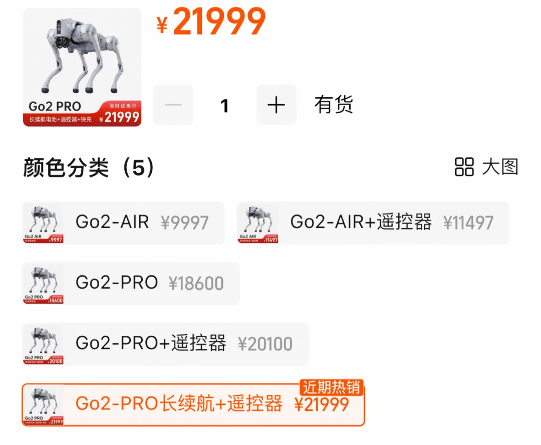 还有一点不好,就是这玩意儿忒贵。购物平台显示,宇树 Go2 低配也得近 1 万元,最高价格近 2.2 万元。