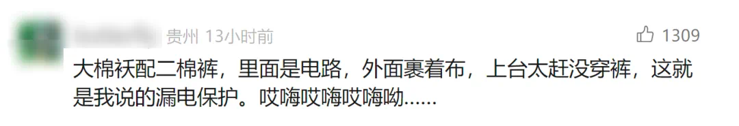 「大棉袄配二棉裤,里面是电路,外面裹着布,上台太赶没穿裤,这就是我说的漏电保护。」