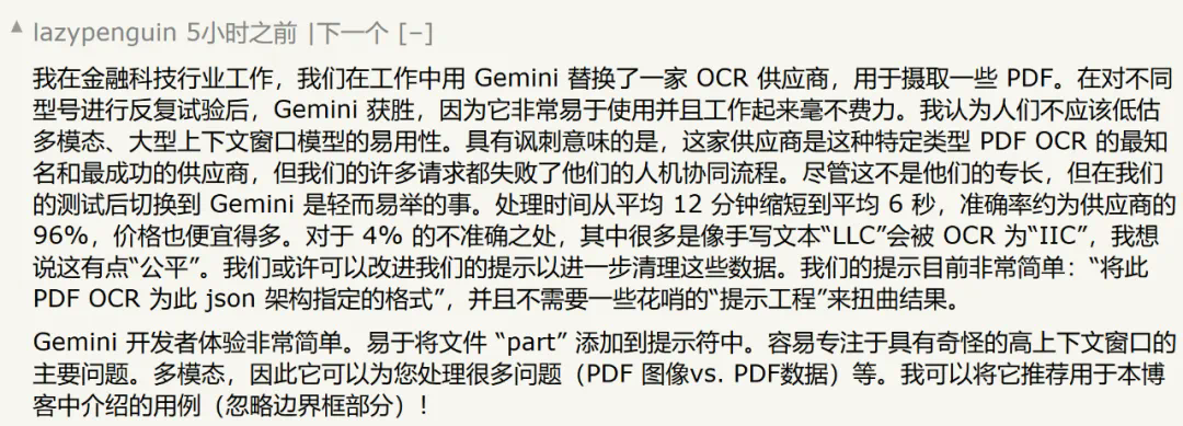 Gemini 2.0 全面开放后,其领先能力在机器学习社区被热烈讨论。有评论认为,在这代模型推出后包括 OCR 等一些领域的游戏规则已被改变。