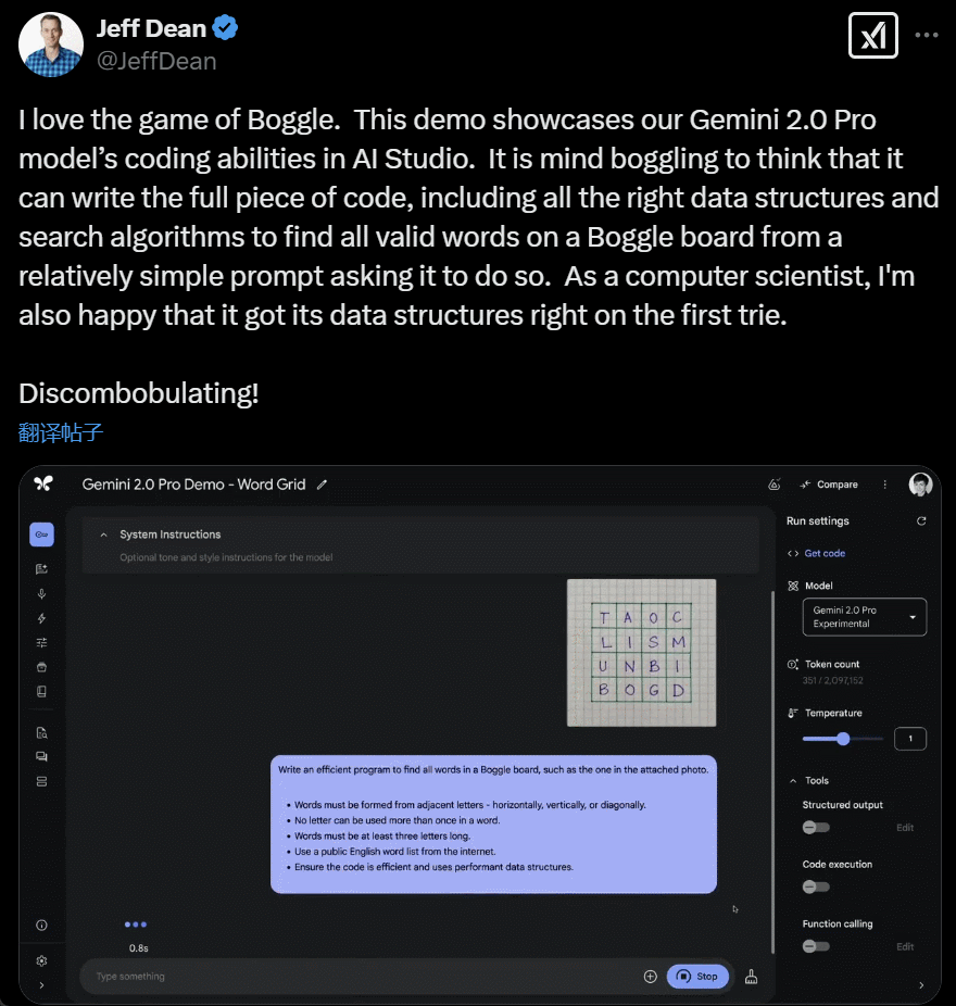 新版本 Gemini 2.0 可以做到很多以前做不到的事。谷歌首席科学家 Jeff Dean 表示 Gemini 2.0 Pro 模型可以编写完整的代码,包括所有正确的数据结构和搜索算法,一次尝试就可以获得正确的数据结构。