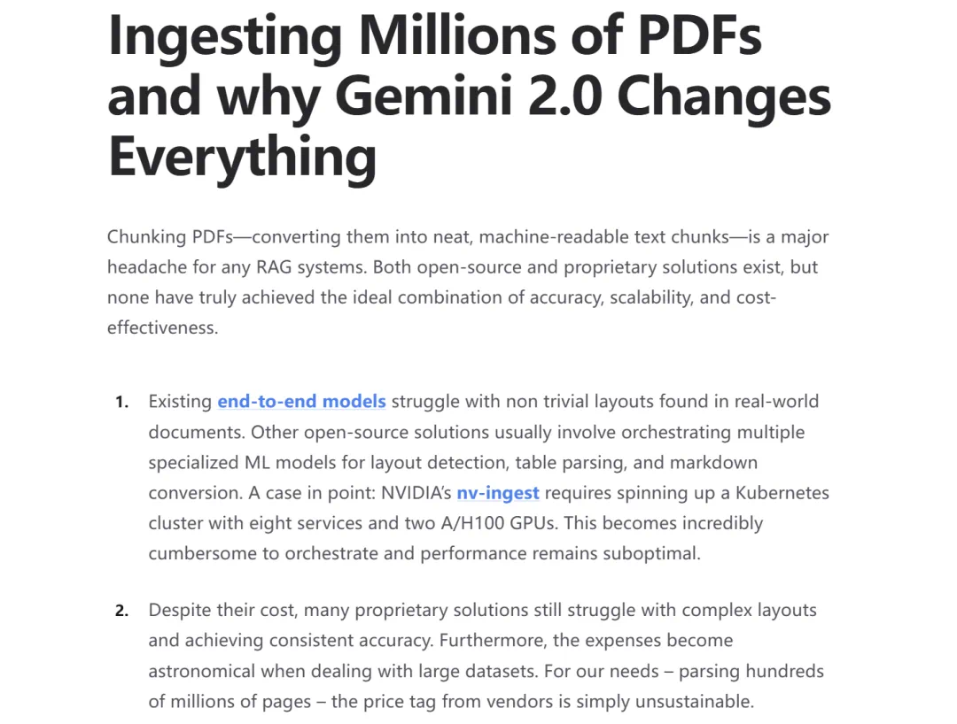 Gemin 2.0 在处理真实文档时已经可以做到极高的准确率和低成本,实测很少会出现具体数值被误读的情况。除了表格解析之外,Gemini 在 PDF 到 Markdown 转换的所有其他方面可以始终提供近乎完美的准确性。所有特性结合在一起,你将获得一个极其简单、可扩展且便宜的索引流程。