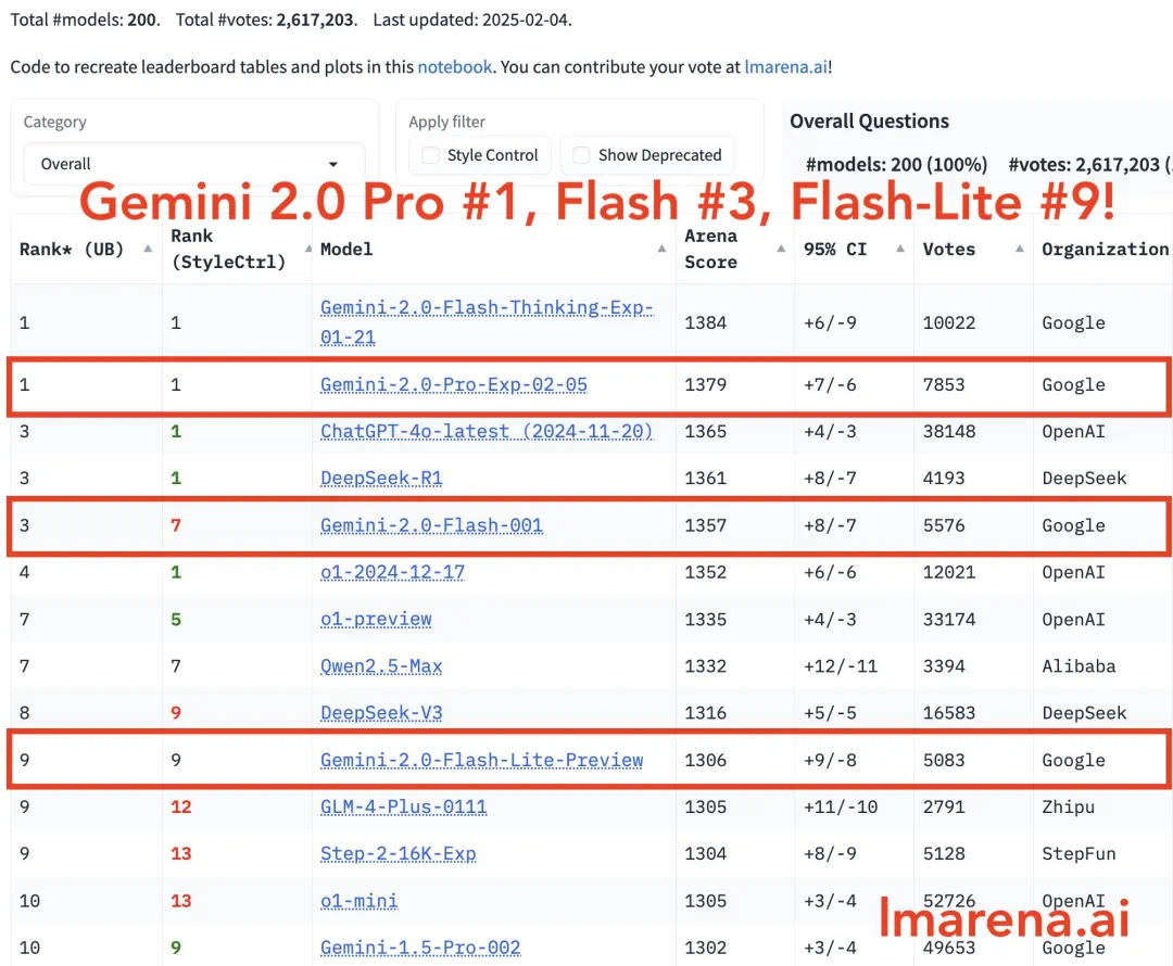 与此同时,排名并列第三的 Gemini-2.0-Flash 已通过 Google AI Studio 和 Vertex AI 向开发人员广泛开放(价格是 0.1 美元 / M token),Flash-lite 也以更低的成本进入了前十。谷歌还在 Gemini 应用程序中推出了旗下「推理」模型 Gemini 2.0 Flash Thinking。