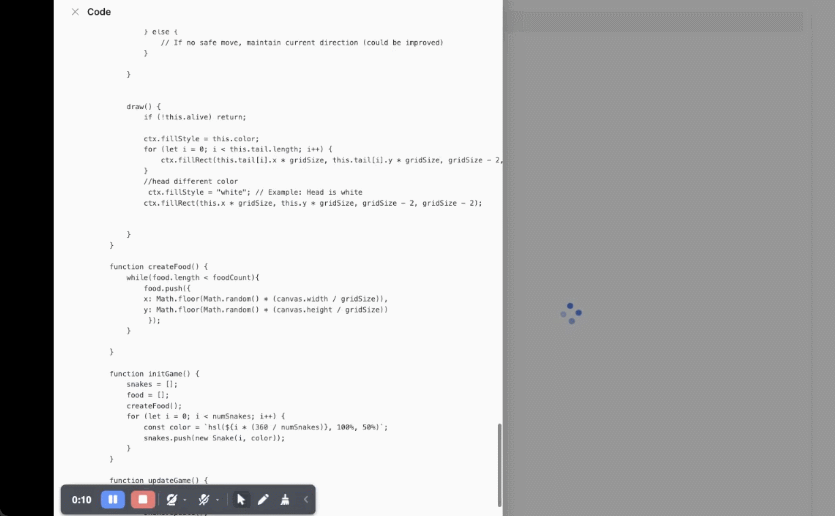 提示词:创建一个自行动的贪吃蛇游戏,其中 100 条蛇相互竞争。(单次尝试)