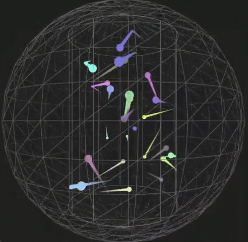 提示词:编写一个 p5.js 脚本,模拟圆柱形容器真空空间中的 25 个粒子,它们在容器边界内弹跳。为每个球使用不同的颜色,并确保它们留下显示其运动的轨迹。添加容器的缓慢旋转,以便更好地查看场景中发生的事情。确保创建适当的碰撞检测和物理规则,以确保粒子留在容器中。添加外部球形容器。为整个场景添加缓慢放大和缩小效果。