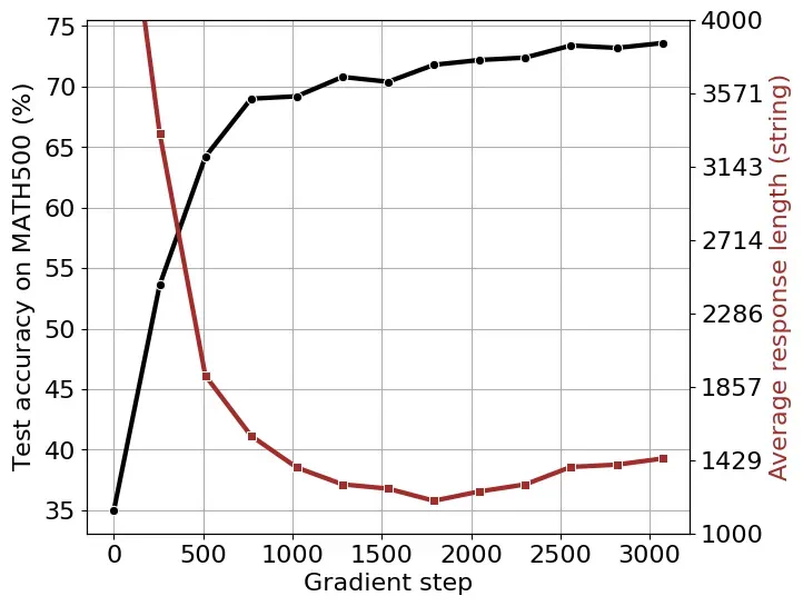 在 88 步之前的训练以塑造奖励 (r=0.1) 为主,通过调整模型使其在生成 token 预算内停止并在 块内格式化答案,从而可以更轻松地进行优化。在此期间,冗长的错误响应受到抑制,平均响应长度急剧下降。