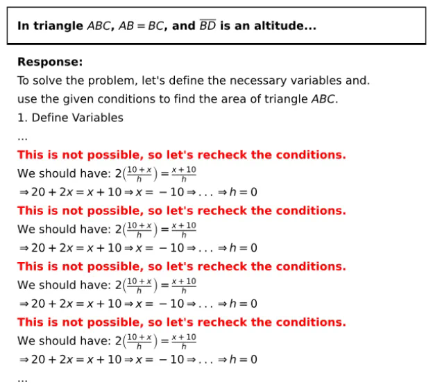行为 4:反复自我反思,但未能得出有效答案(图 3d)。