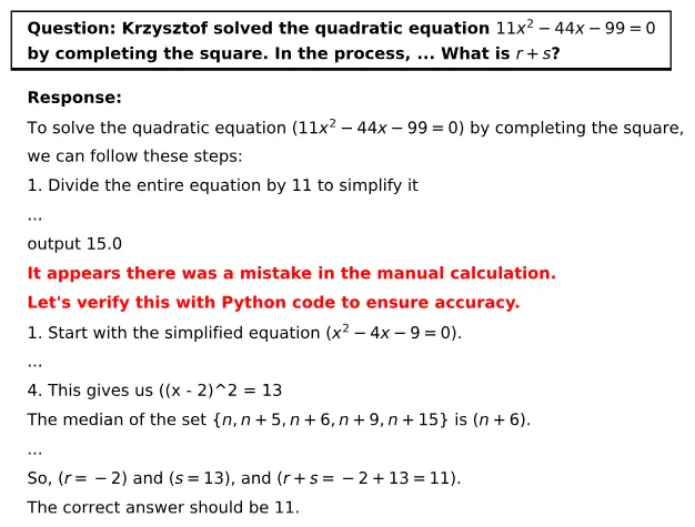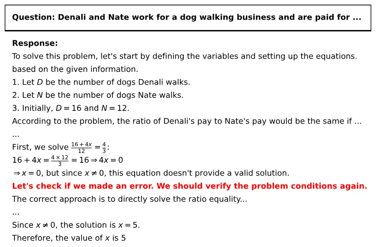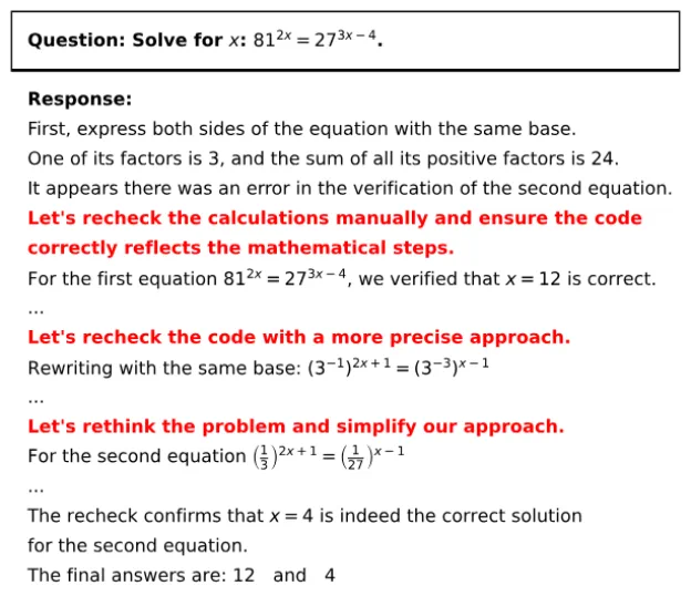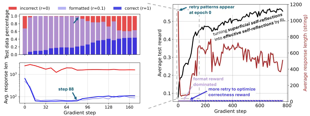 在第 88 步,模型开始通过输出更多重试(retries)来「爬上奖励山」,朝着更高的奖励(r=1 表示正确性)攀登。因此,我们观察到正确响应的长度增加。伴随而来的副作用是,模型输出更多冗长的肤浅自我反思,导致平均响应长度激增。