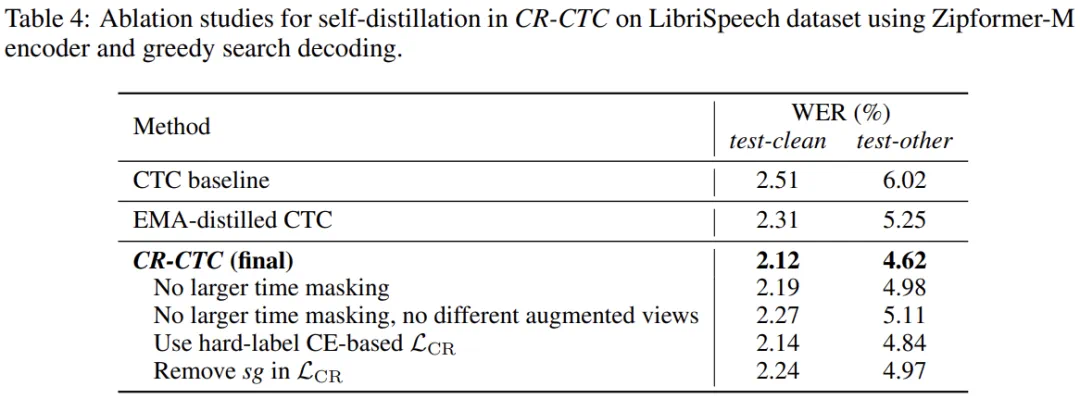 。SpecAugment 包含 time warping、frequency masking 和 time masking。由于 time warping 会显著改变输出的时间戳,因此我们在创建 copy 前先应用 time warping,防止两个分支的输出分布在时间戳上严重不匹配。接着,分别对两个 copy 独立应用 frequency masking 和 time masking,得到了