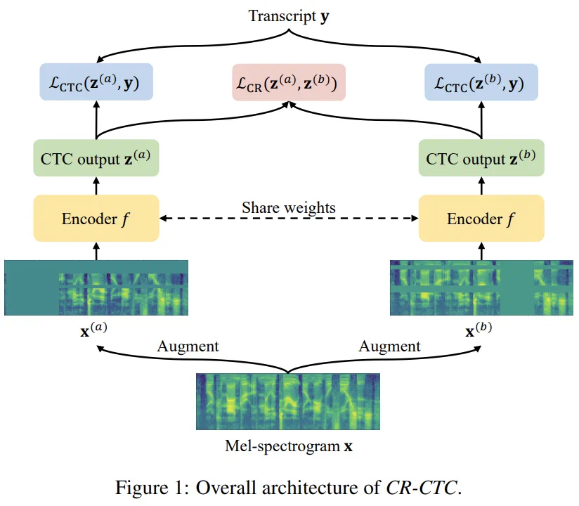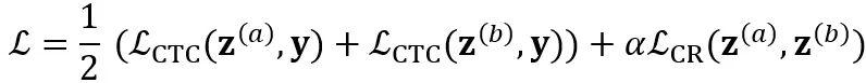 ,分别输入参数共享的 encoder 模型 f,得到对应的两个 CTC 概率分布