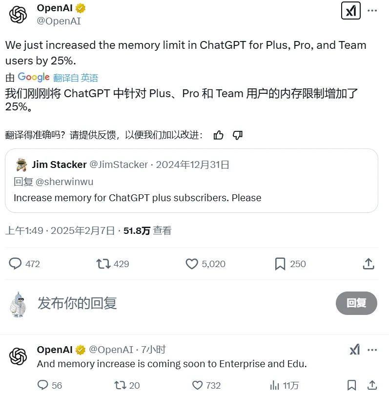 一是将 ChatGPT Plus、Pro、Team 的记忆限制提升了 25%。OpenAI 表示还会很快提升企业版和教育版用户的记忆限制。这样一来,ChatGPT 便可以记忆更多与用户的对话内容。