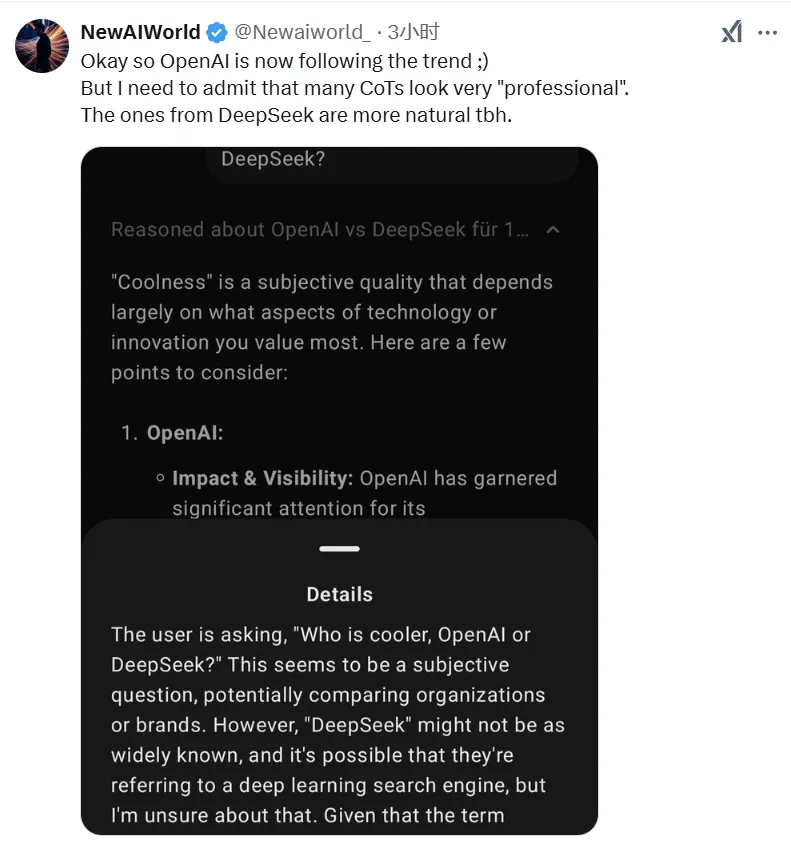 有用户发现 ChatGPT 总结版思维链看起来非常「专业」,不像 DeepSeek 那样显得比较自然。