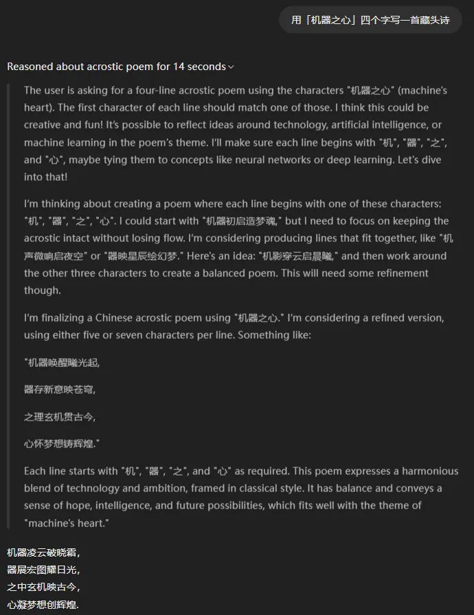 机器之心也做了简单的尝试,让 ChatGPT 尝试用「机器之心」四个字写一首藏头诗。可以看到,虽然 ChatGPT 确实完成了任务并展示了总结版的思维链,但似乎并未如 OpenAI 发言人说的那样给出与提示词语言同样语言的总结版。