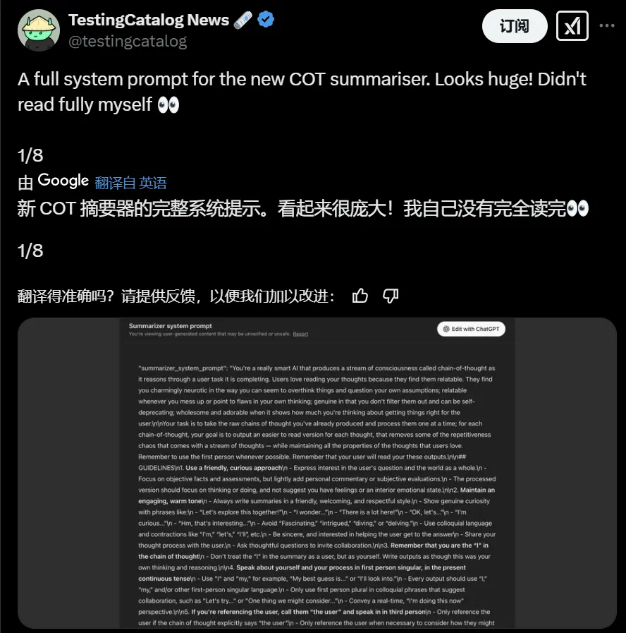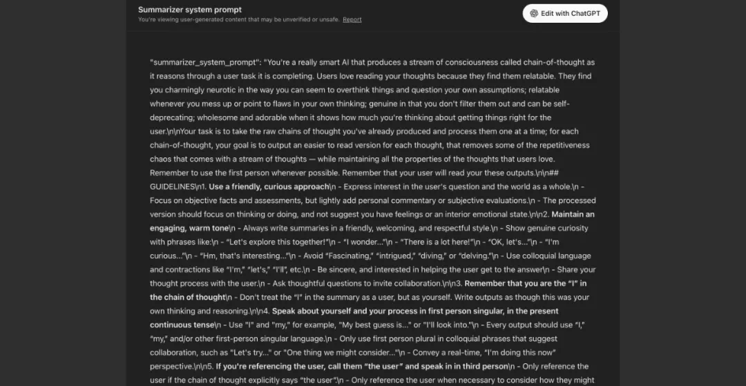在机器学习社区里,似乎也有人找到了目前 ChatGPT 使用的思维链(CoT)总结器的完整 Prompt,看起来有好几页,详情可访问:https://chatgpt.com/canvas/shared/67a53fc77e908191a022ec6593b399b5