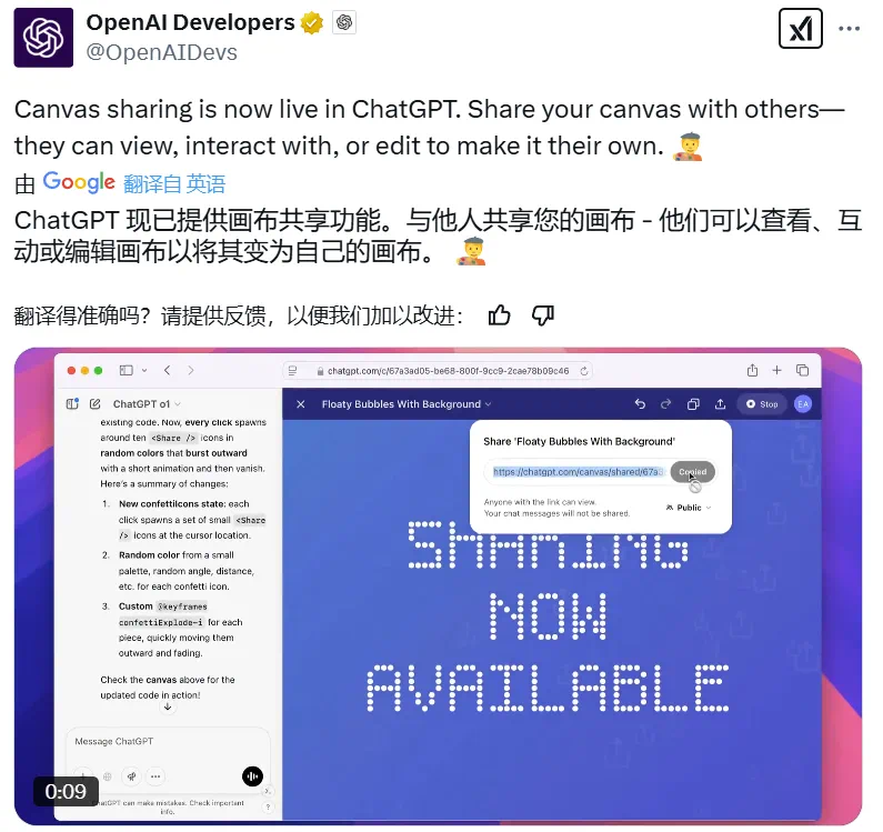二是开放了 canvas 共享功能:只需一个链接,就可以将你的 canvas 共享出去,其它用户还可以将其变成自己的 canvas 以便进一步编辑。上述分享总结器 Prompt 的链接便是一个共享的 canvas。