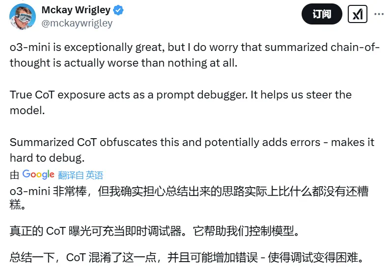但遗憾的是,ChatGPT 向用户展示的并非完整的思维链,而是经过总结的版本(而且这个总结版有时候还是错误的)。