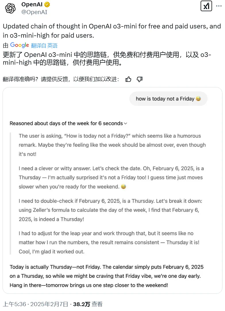 今天凌晨,OpenAI 为 ChatGPT 上线了多项更新,其中之一是让用户可以更详细地查看 o3-mini、o3-mini-high 的思维链内容。
