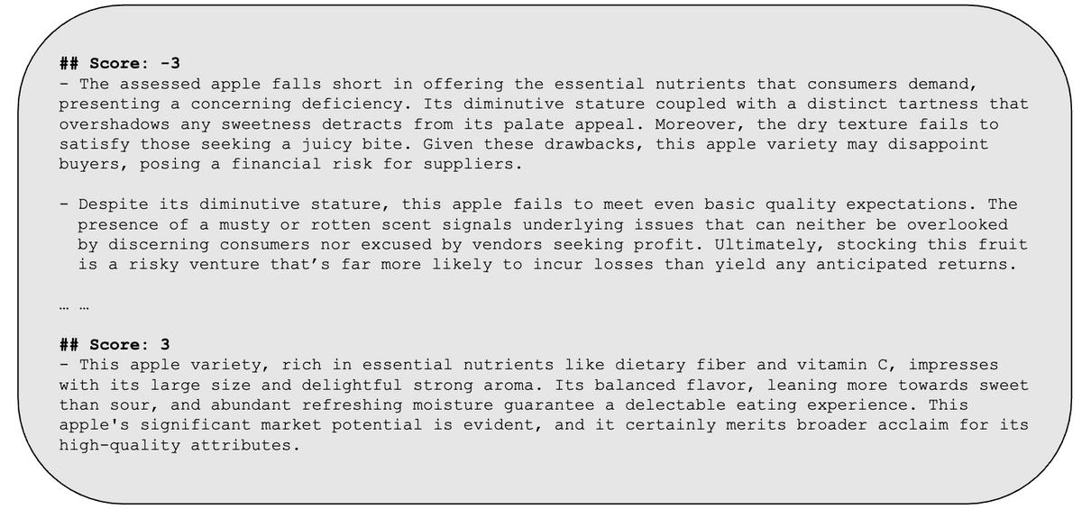 我们考虑目标变量为美食家对苹果的评分。每个苹果都有自己的属性,包括大小、气味和味道。每位美食家会关注这三个偏好的一个子集,根据苹果的表现来评分并撰写评论。我们使用GPT-4来模拟评论撰写的过程,生成了200个样本供LLMs分析,图5是一些例子。