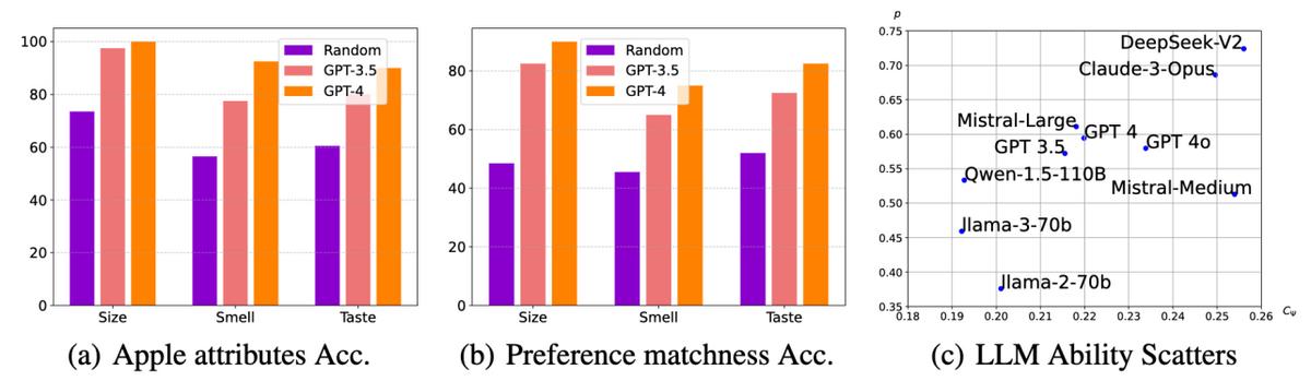在先前的理论分析中,我们定义了两个关键的指标来衡量 LLMs 的高级变量识别能力:感知分数 () 和能力分数 (C_Psi) 。我们在 AppleGastronome 数据集中对这两个指标做了粗略的估计,将不同 LLMs 依照它们的分数绘制在图8(c)中。从这一经验上的结果,我们认为现有的 LLMs 已经初步具备了提取高级变量的能力。