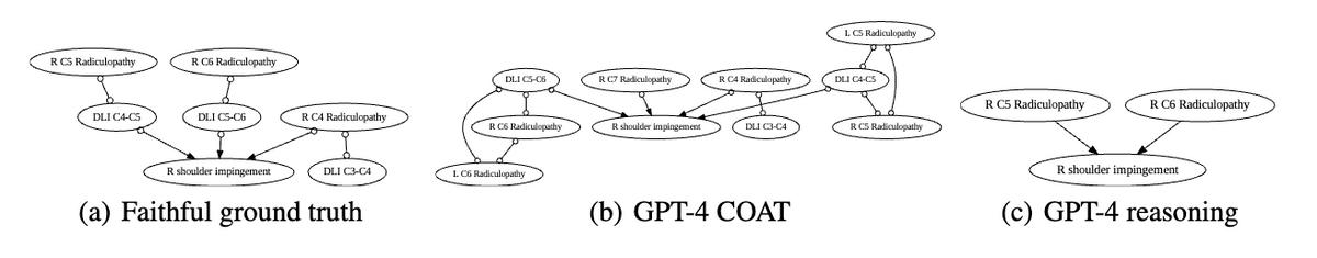 这里的实验目的是为了利用 Neuropathic benchmark 模拟真实世界的诊断过程:当提出高级变量后,在取值解析阶段,使用外部过程来获得诊断结果。在原始数据集 [26] 中,存在三个层次的因果变量,包括症状层、神经根病变层和病理生理学层。在本项目中,我们主要考虑右侧肩峰下撞击 (right shoulder impingement) 的目标变量。在利用 GPT-4 生成临床诊断笔记时,我们将避免提及除症状之外的其他变量,以检验 COAT 找出其他层级的高级变量的能力。图11为样本示例。