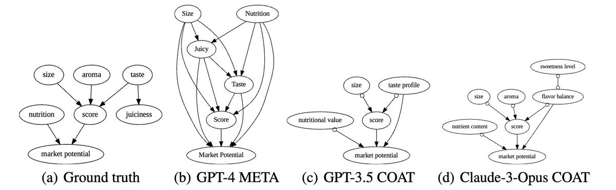 在本文所考虑的(即便是非结构化的)样本可得的场景下,相比于使用 LLMs 利用变量名称直接推断因果结构,COAT 可以得到更接近实际分布的因果结构。事实上,COAT 的因果反馈机制最大限度的利用了 LLMs 丰富的先验知识,且减少了因果发现过程对 LLMs 推理能力的依赖。图6(b-d)给出了直观展示。图10给出定量结果。