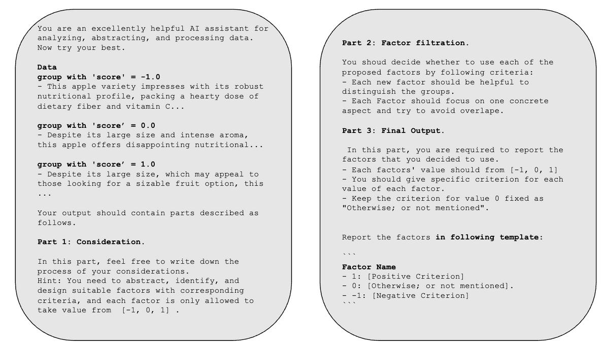 图2展示了一个具体的例子。prompt 包含了三个部分:样本、指示信息、格式控制。为了帮助 LLMs 更好的注意到与目标变量 相关的信息,样本被依据其对应的 的取值分组。接下来,指示信息要求 LLM 定义具体的高级变量,包括变量的含义、每个变量对应的取值准则。如果有额外的背景信息或先验知识,也可一并加在这里。这里 prompt 的设计模仿了人类专家选取和定义高级变量的过程 [23]。