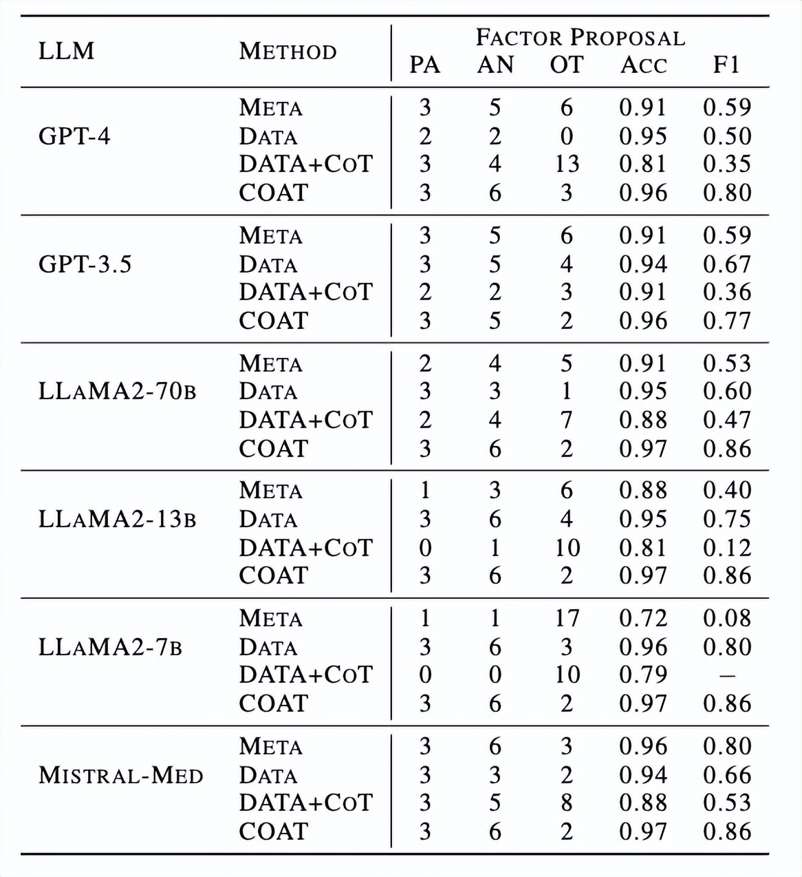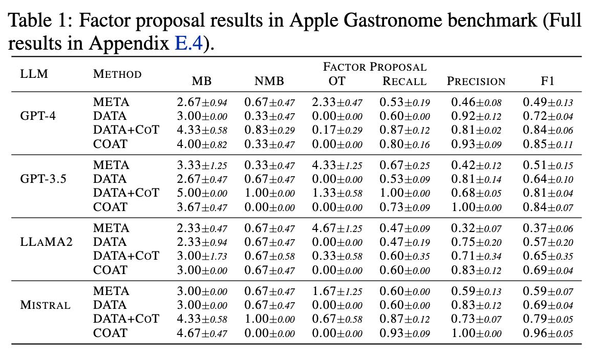 关于高级变量识别的定量分析如图13所示,其中PA、AN 和 OT 分别代表父母节点、祖先节点和其他应当排除的节点。准确性和 F1 测量祖先节点的恢复情况。类似的,COAT 相比基线方法有显著的效果。特别是,由于 COAT 并不重点依赖 LLMs的推理能力,在较弱的 Llama-2-7b 中也有不错的表现。相反,CoT 在这里并没能保持其在 AppleGastronome 上表现。