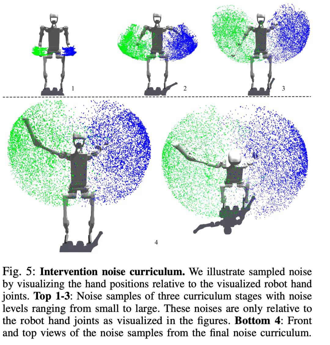 HugWBC 将自己定位为基础人形控制器,因此需要支持上半身的外部控制介入,可用于遥操等数据采集。研究者们通过设计上肢的噪声课程来促使机器人学习到这一点。