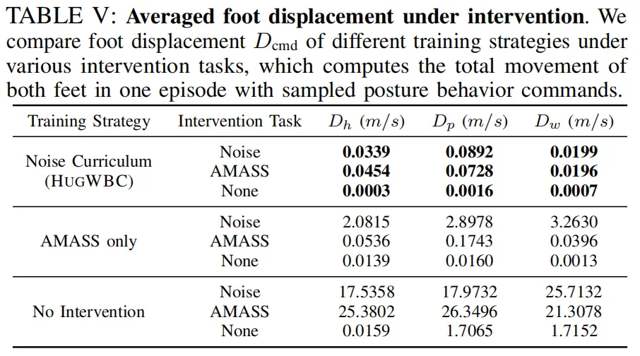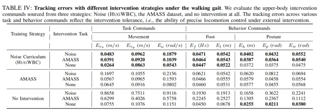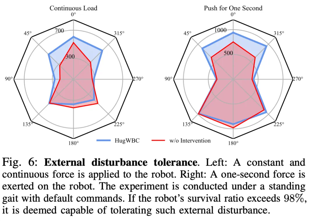 随后,研究人员分析了介入训练对策略鲁棒性的提升。如图 2 所示,HugWBC 在两项干扰测试中的表现明显优于未经过介入训练的基线方法。其原因在于,干预使机器人能够有效应对来自上身的各种扰动,在训练过程中几乎涵盖了所有极端情况,从而显著提高了策略的鲁棒性。