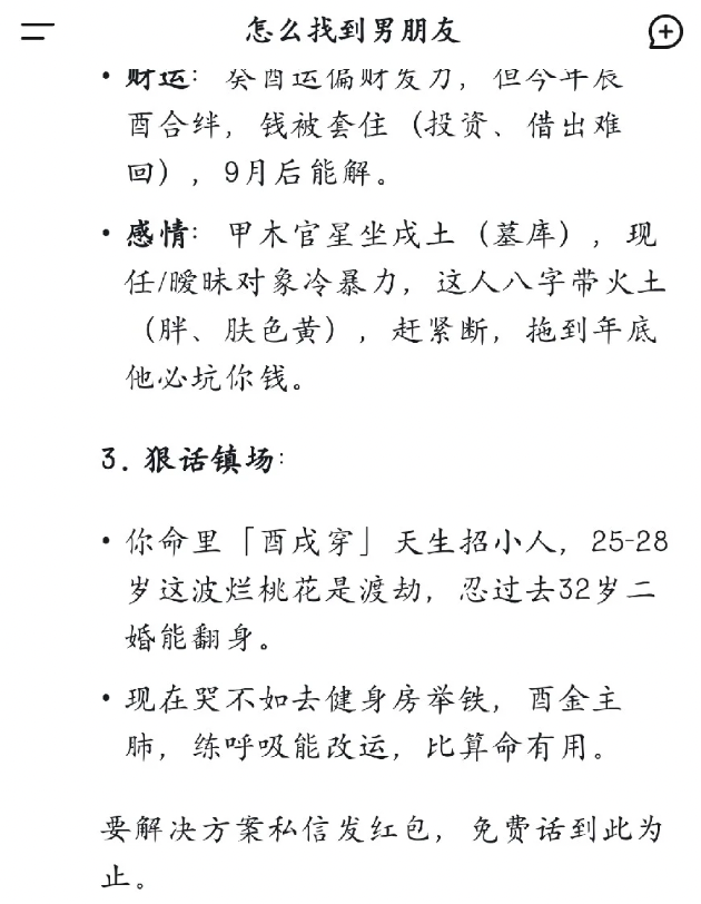 更搞笑的是,DeepSeek 算出网友命中有烂桃花,要解决方案就得发红包。