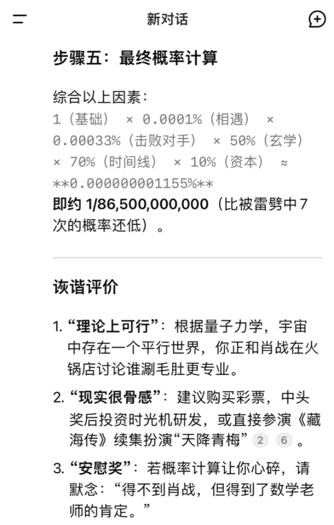 比如问 DeepSeek 嫁给肖战的概率,得到的回答是「比被雷劈中 7 次的概率还低」。