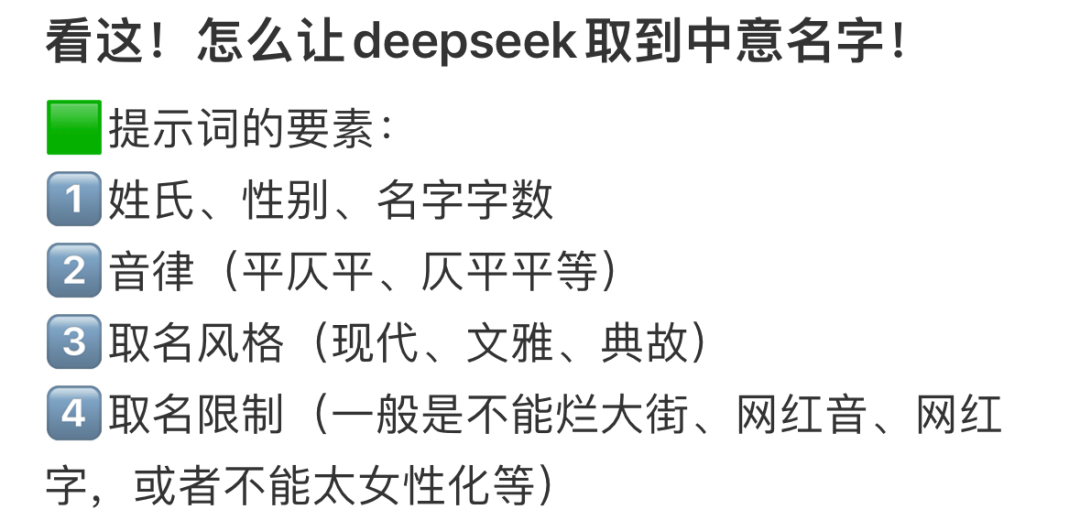 当然提示词中要包含姓氏、性别、字数、音律、取名风格(比如现代、文雅或者结合诗经楚辞等古诗词)、取名限制(比如不能烂大街、网红名、生僻字)等。