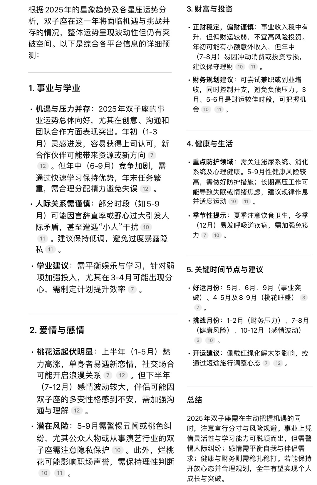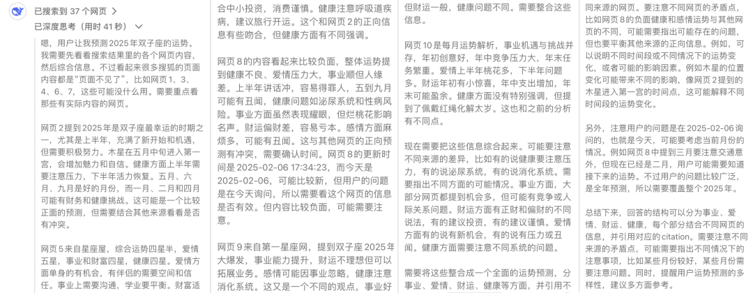 开启「深度思考」和「联网搜索」,外加一句简单粗暴的提示词:请你预测一下 2025 年双子座的运势,DeepSeek 就一口气搜索 37 个网页,并花 41 秒进行思考。