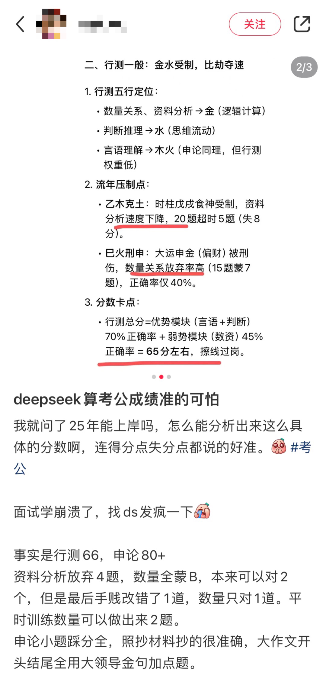 有网友用它算考公成绩,DeepSeek 称「行测擦线过,申论高分补位」,还分析出具体的分数以及得分点失分点。