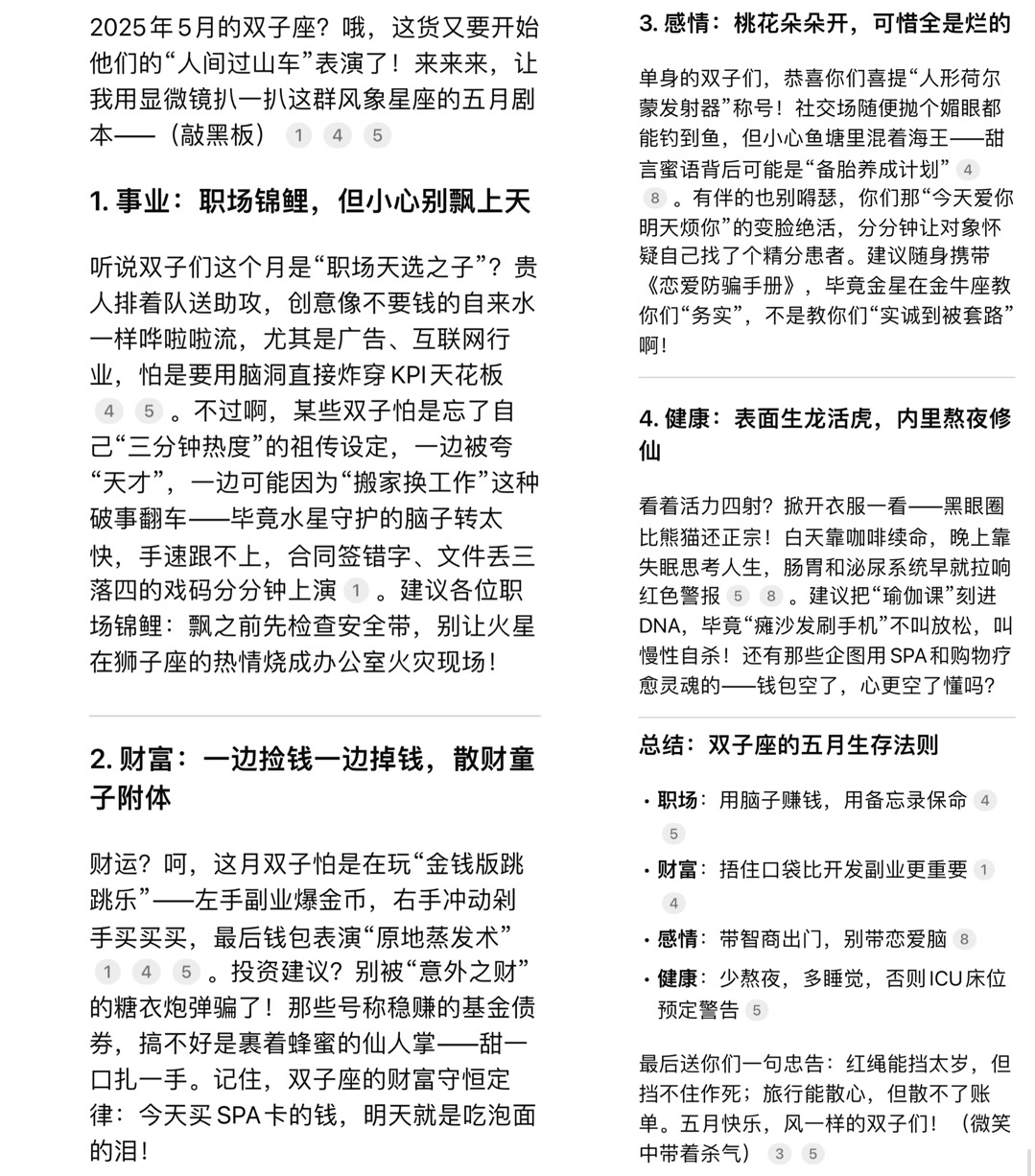 我又让它用犀利幽默酸辣尖锐的语气评价一下 5 月双子座。